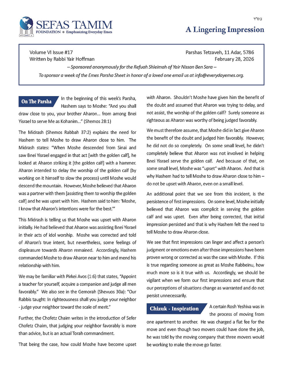February 7, 2026; 20 Shevat, 5786 Sponsored anonymously for the Refuah Shleimah of Yair Nissan Ben Sara